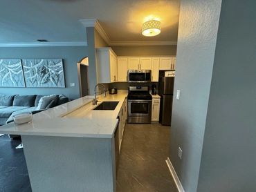 Tastefully decorated, this 2-bedroom, 2-bathroom gem boasts lofty 10-foot ceilings and seamless flooring throughout. The well-designed kitchen, ideal for those who enjoy cooking while socializing, flows effortlessly into a spacious dining area for 8 and a generously sized living room, creating an expansive Great Room.